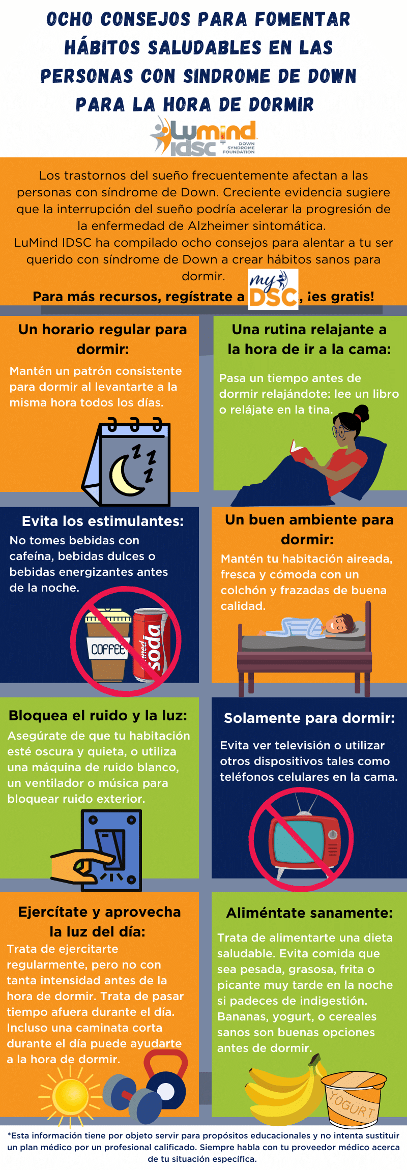 LuMind IDSC ha compilado ocho consejos para alentar a tu ser querido con síndrome de Down (o cualquier otra persona), a adquirir mejores rutinas para la hora de dormir. Sin embargo, esto es solo el primer paso, es importante tener en mente que los trastornos del sueño son una condición prevalente en la población con síndrome de Down. A veces, las personas necesitan más que una habitación oscura para poder conciliar el sueño.